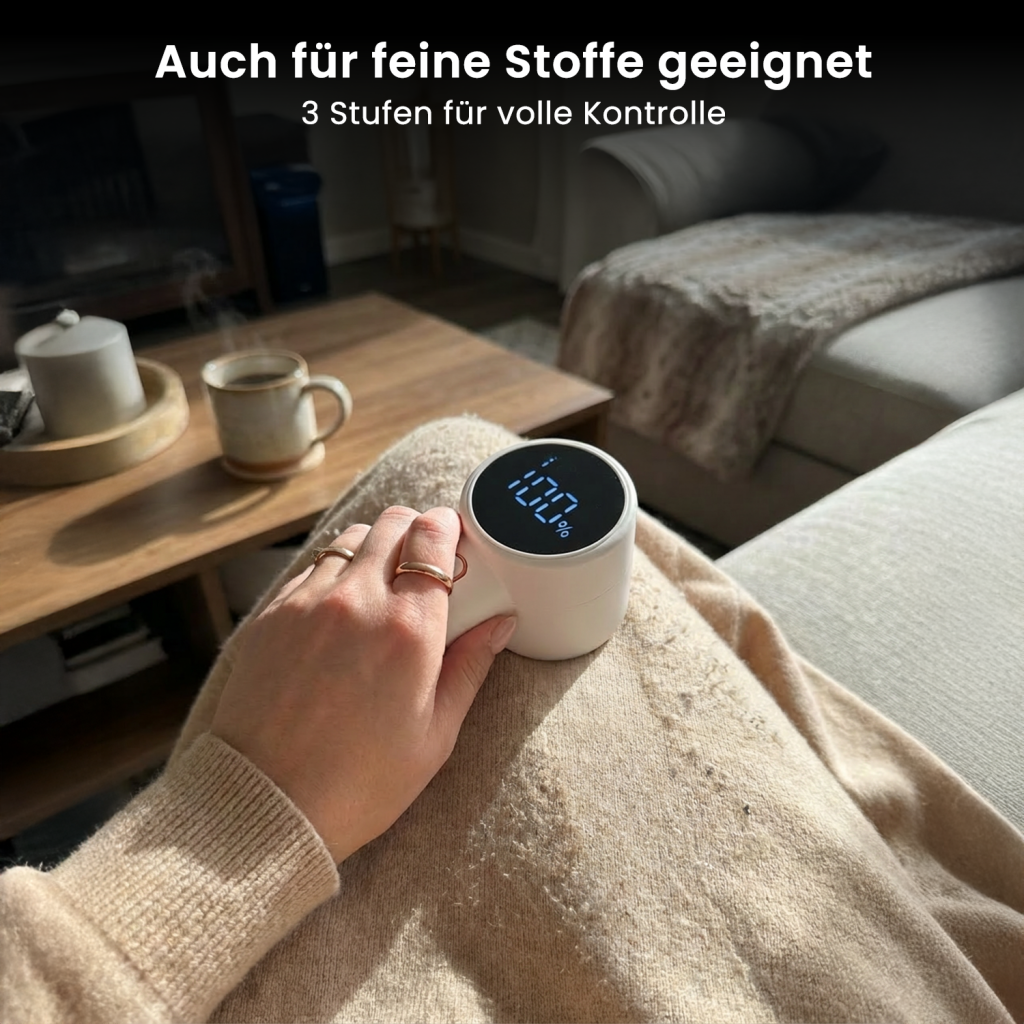 Mit 3 einstellbaren Geschwindigkeiten passt du FuzzClean mühelos an. Sanft für weiche Pullover, kraftvoll für Sofas und Decken.