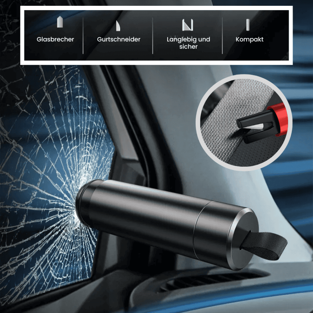 Mit seinem schnellen Fensterschlag und leistungsstarken Gurtschneider bietet SAFEKEY eine sofortige Lösung. Seine kompakte Form und robuste Bauweise machen ihn zum idealen Retter in der Not.