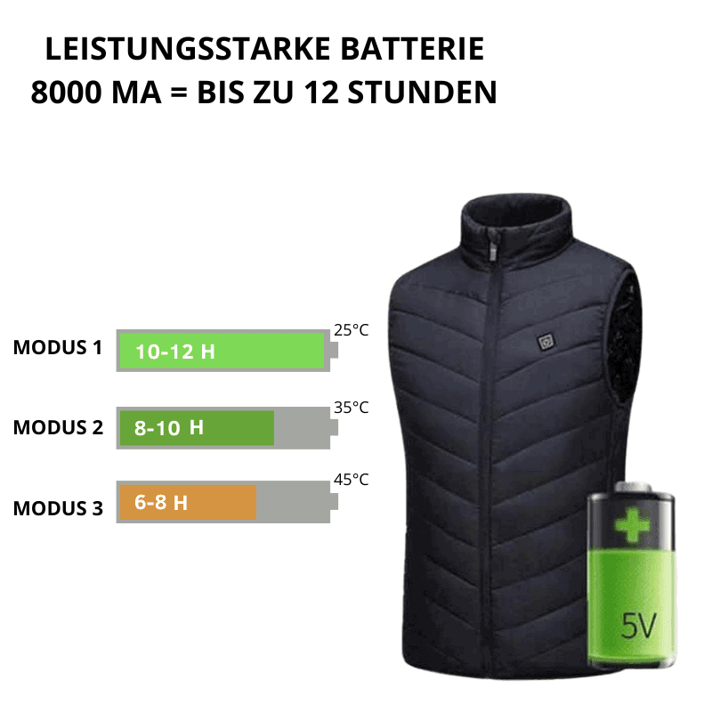 Verbinde die Weste mit einer Powerbank (nicht enthalten), die du bequem in der Innentasche unterbringen kannst. Das spezielle Material speichert die Wärme effizient, verbraucht wenig Strom und hält dich bis zu 8 Stunden lang warm.
